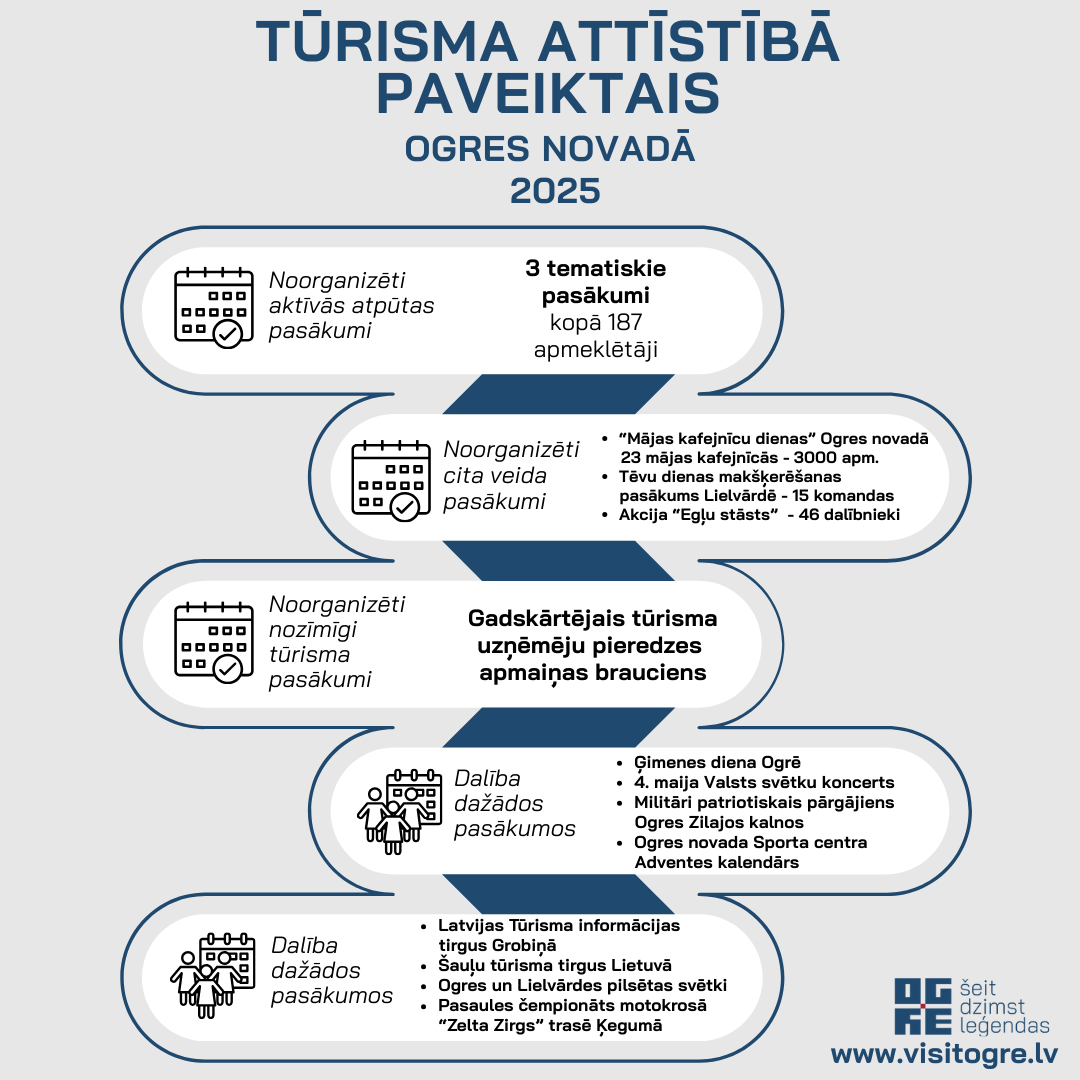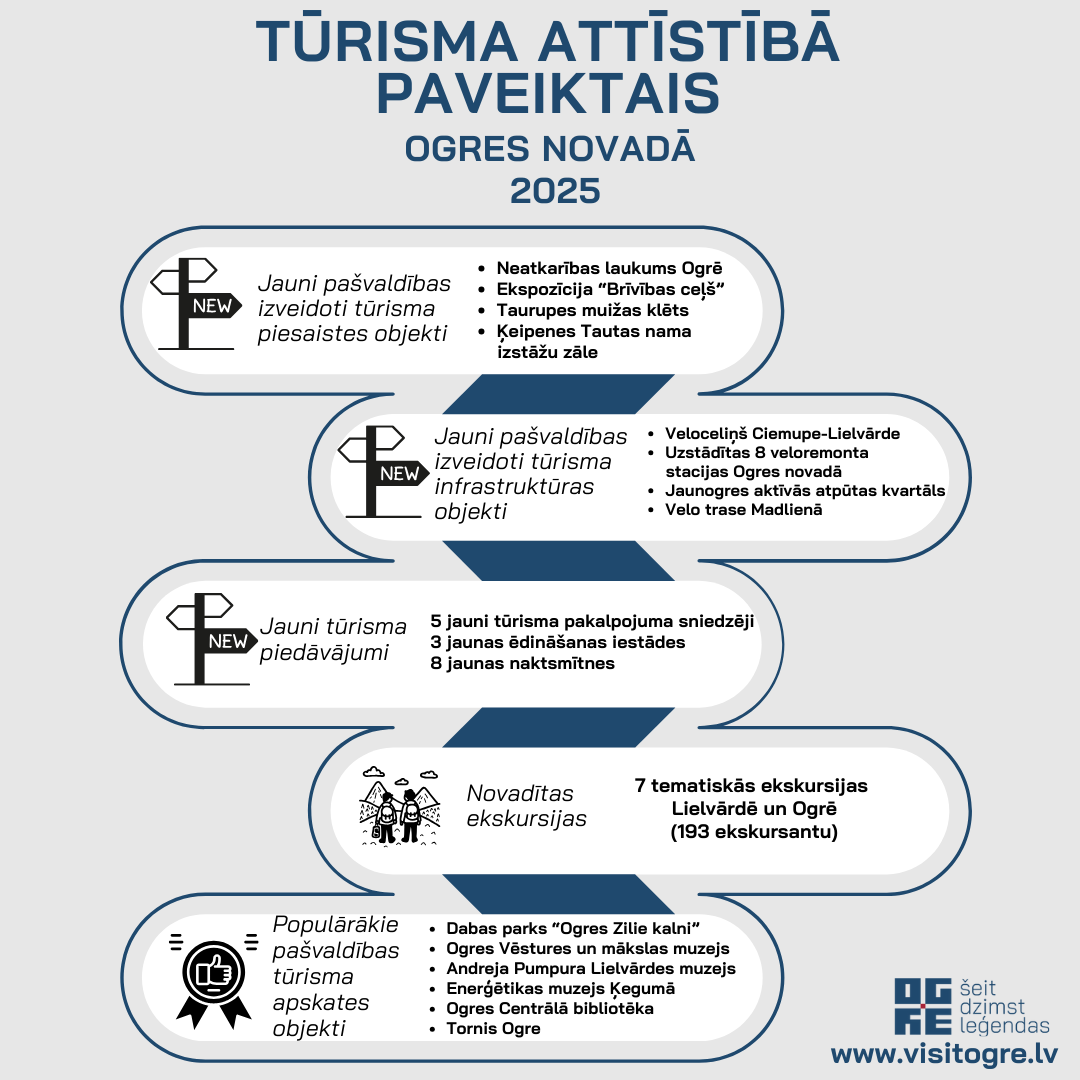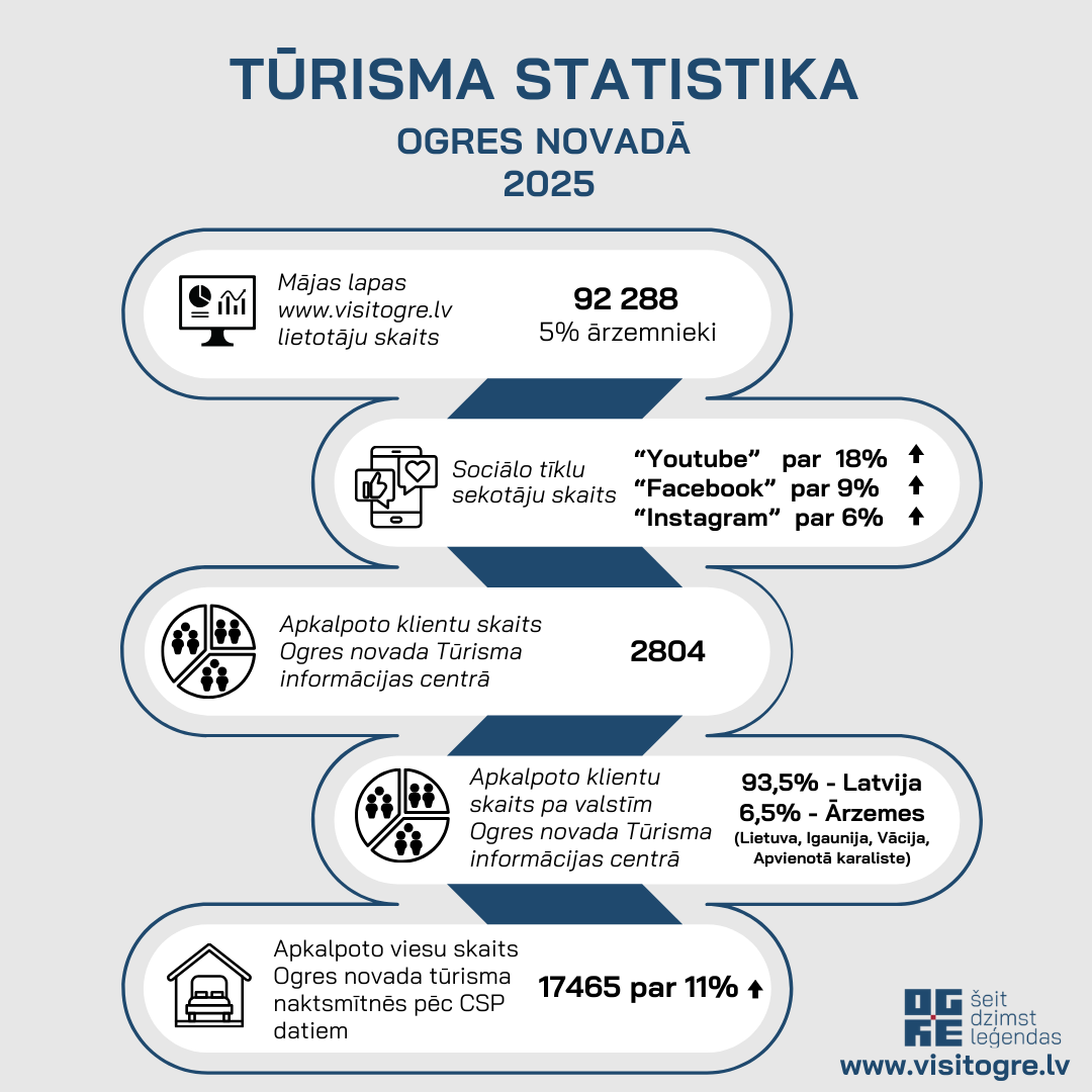 2025. gads Ogres novadā iezīmējies ar mērķtiecīgu tūrisma nozares attīstību, ko apliecina gan digitālo kanālu pieaugošā nozīme, gan stabila apmeklētāju interese par novada piedāvājumu. Tūrisma statistikas dati liecina par veiksmīgu komunikāciju ar auditoriju, augošu sabiedrības iesaisti un plašu interesi par pasākumiem un kultūrvēsturiskā mantojuma izzināšanu. Vienlaikus aizvadītajā gadā īstenoti vairāki nozīmīgi infrastruktūras un kultūrvides projekti, kas būtiski stiprinājuši Ogres novada pozīcijas kā daudzveidīgam un pieejamam tūrisma galamērķim.
