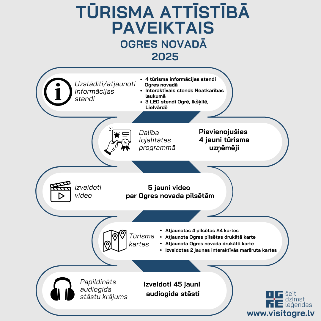 2025. gadā veikti vairāki infrastruktūras uzlabojumi - atjaunoti 2 tūrisma informatīvie stendi Madlienā, dabas parkā “Ogres Zilie kalni” un pie vēsturiskās Ogres Kūrmājas uzstādīti jauni informatīvie stendi.