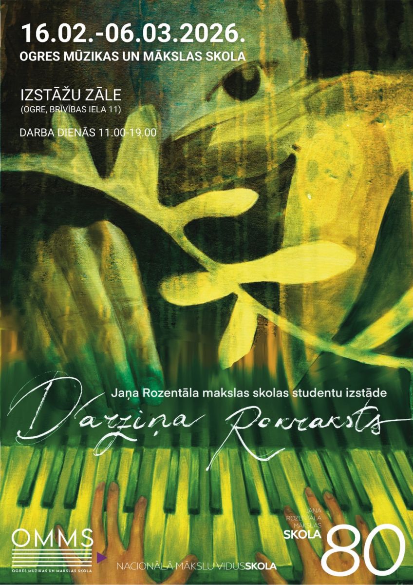 - Ogres Mūzikas un mākslas skolas izstāžu zālē šobrīd apskatāmas divas izstādes, ko atveduši skolas draugi – Jaņa Rozentāla Mākslas skola. Radošo noslēguma darbu izstāde apkopo J. Rozentāla Mākslas skolas profesionālās ievirzes audzēkņu radošo veikumu. Darbu autori ir jaunie mākslinieki – tāda paša vecuma audzēkņi kā mūsu skolā. Izstāde “Dārziņa rokraksts” veidota no J. Rozentāla Mākslas skolas 2. un 3. kursa studentu darbiem. Skolotājas Vitas Jurjānes vadībā jaunieši pētījuši komponista Emīla Dārziņa dzīves līkločus, klausījušies viņa muzikālo mantojumu un iedziļinājušies mūzikas tonālajā krāsu izjūtā. Rezultātā tapušas 15 gleznas, kas apvienotas ciklā “Dārziņa rokraksts”. Ceturtdien, 26. februārī, plkst. 17.00 izstāžu zālē notiks tikšanās ar J. Rozentāla Mākslas skolas studentiem, kuri pastāstīs par mācībām un iestājeksāmeniem savā skolā. Pēc 9. klases jaunieši J. Rozentāla Mākslas skolā var apgūt gan mākslas, gan vispārizglītojošos priekšmetus un, sekmīgi absolvējot, iegūt profesionālās vidējās izglītības diplomu ar kvalifikāciju “Vizuālās mākslas speciālists”. Uz tikšanos mīļi aicināts ikviens interesents. Izstādes apskatāmas līdz 6. martam darba dienās no plkst. 11.00 līdz 19.00 Ogres Mūzikas un mākslas skolas izstāžu zālē, Brīvības ielā 11, Ogrē.