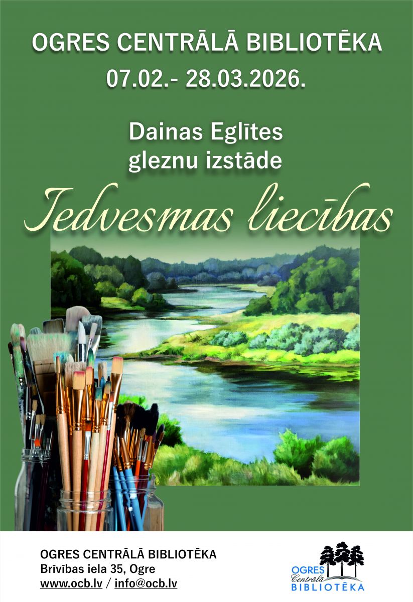 No 7. februāra Ogres Centrālās bibliotēkas 1. un 2. stāva ātrijā apskatāma mākslinieces Dainas Eglītes personālizstāde “Iedvesmas liecības”. Daina Eglīte ir māksliniece un mākslas pedagoģe, kas strādā dažādās tehnikās un materiālos, vienmēr meklējot jaunus izteiksmes līdzekļus un attīstot radošo pieeju mākslā. Viņas iedvesmas avots ir daba tās mainībā un harmonijā — zeme, zāle, varavīksne vasarā un kupenas ziemā, putnu balsis rītos un zvaigžņotais debesjums naktīs. Tā ir vieta, kur atgūt spēkus, smelties enerģiju un radošās ieceres, kas nu īstenojušās izstādē. Izstāde “Iedvesmas liecības” bibliotēkā apskatāma līdz 28. martam. Gaidām mākslas mīļotājus bibliotēkas darba laikā. Ieeja — bez maksas.