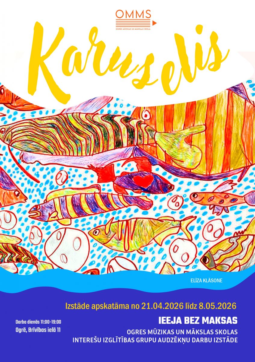 3.Ogres Mūzikas un mākslas skolas izstāžu zālē atklāta interešu izglītības grupu bērnu darbu izstāde KARUSELIS. Skolotāji: Astrīda Mazule, Inese Karpova, Inese Kleine-Pētersone, Elīna Umule, Zane Raičenoka-Raišonoka. Kuratores: Kristīne Bicāne, Kristīne Jukmane. Izstāde skatāma darba dienās no pl. 11:00 līdz 19:00 Brīvības ielā 11 līdz 8. maijam. Kā arī tā būs atvērta svētku dienā, 4. maijā no pl. 12:00 līdz 16:00.