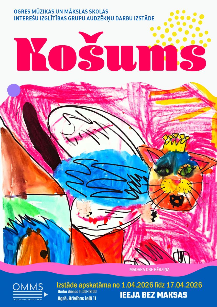 11. Ogres Mūzikas un mākslas skolas mākslas jomas interešu izglītības grupu audzēkņu darbu 1. izstāde KOŠUMS skatāma līdz 17. aprīlim darba dienās no pl. 11:00 līdz 19:00 OMMS izstāžu zālē, Brīvības ielā 11, Ogrē.