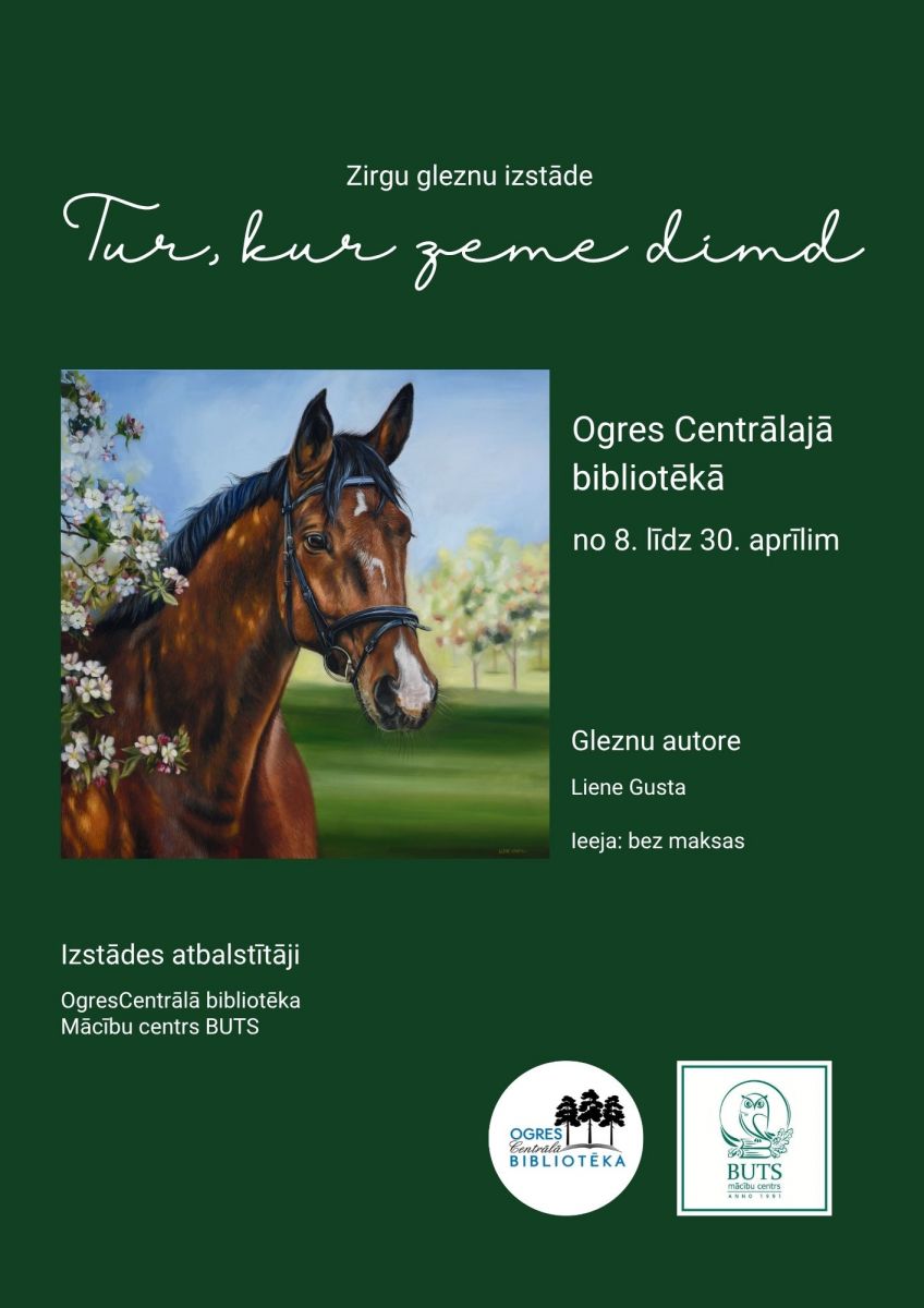1. No 8. līdz 30. aprīlim Ogres Centrālās bibliotēkas abonementā apskatāma Mākslinieces Lienes Gustas izstāde "Tur, kur zeme dimd" ! Tā ir vizuāla tikšanās ar spēku, kustību un iekšējo mieru – vietu, kur dabas enerģija savienojas ar līdzsvaru un izturību. Gleznas radījusi talantīgā māksliniece Liene Gusta, Latvijas Mākslas akadēmijas maģistre. Viņas eļļas gleznās zirgi atklājas jaunā gaismā – cēli, spēcīgi un reizē harmoniski. Kāpēc tieši zirgi? 12 izteiksmīgie zirgu portreti rotā Mācību centrs BUTS 2026. gada kalendāru, jo 2026. gads ir Zirga gads – spēka, kustības un neatlaidības simbols. Izstāde apskatāma bibliotēkas darba laikā. Ieeja – bez maksas. Attēlā: maija modelis – zirgs Landess.