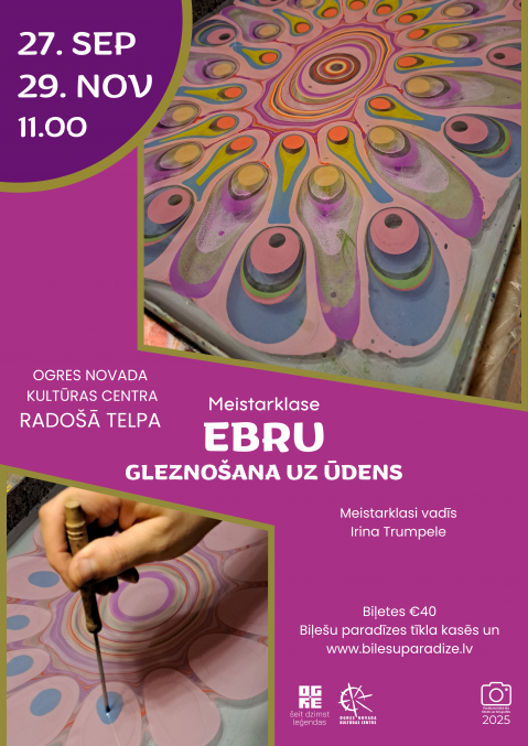 29. novembrī plkst. 11.00 Ogres novada Kultūras centra Radošajā telpā meistarklase EBRU – GLEZNOŠANA UZ ŪDENS.