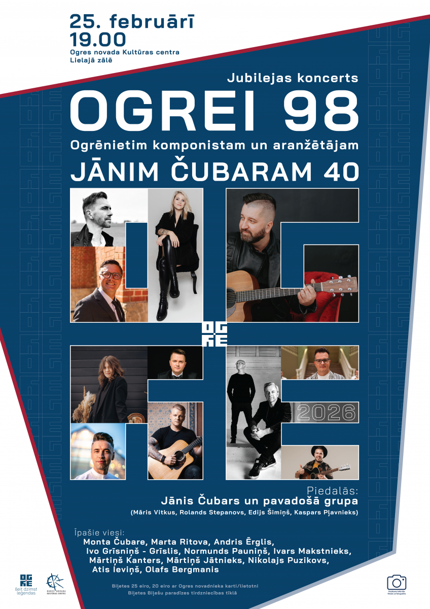25. februārī plkst. 19.00 Ogres novada Kultūras centrā aicinām uz svētku koncertu “OGREI 98. Ogrēnietim, komponistam un aranžētājam JĀNIM ČUBARAM 40”, kurā vienlaikus atzīmēsim pilsētas 98. gadskārtu un izcila ogrēnieša – komponista, aranžētāja un producenta Jāņa Čubara 40 gadu dzimšanas dienu.