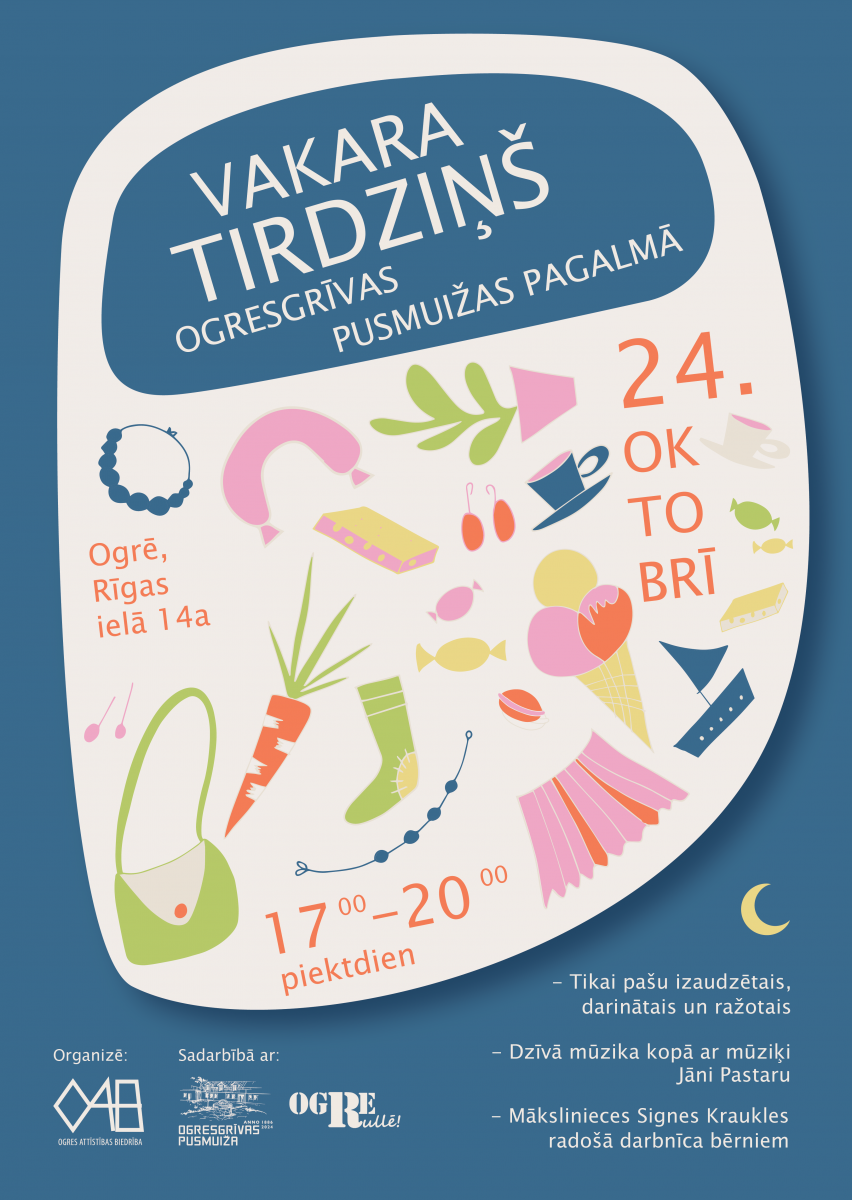 24.oktobrī no plkst. 17.00 līdz 20.00 atjaunotajā Ogresgrīvas pusmuižas staļļa ēkā un tās pagalmā (Rīgas ielā 14a, Ogrē) notiks vakara tirdziņš. Pasākumā piedalīsies mājražotāji, amatnieki un mazie uzņēmēji, kas piedāvās pašu izaudzētu, saražoto un darināto. Visi kopā baudīsim vakaru, kurā muzikālo priekšnesmu sniegs ģitārists Jānis Pastars, savukārt bērniem būs iespēja radoši izpausties darbnīcā kopā ar mākslinieci Signi Kraukli. Pasākumu rīko “Ogres Attīstības Biedrība” sadarbībā ar projektu “Ogre rullē!”.