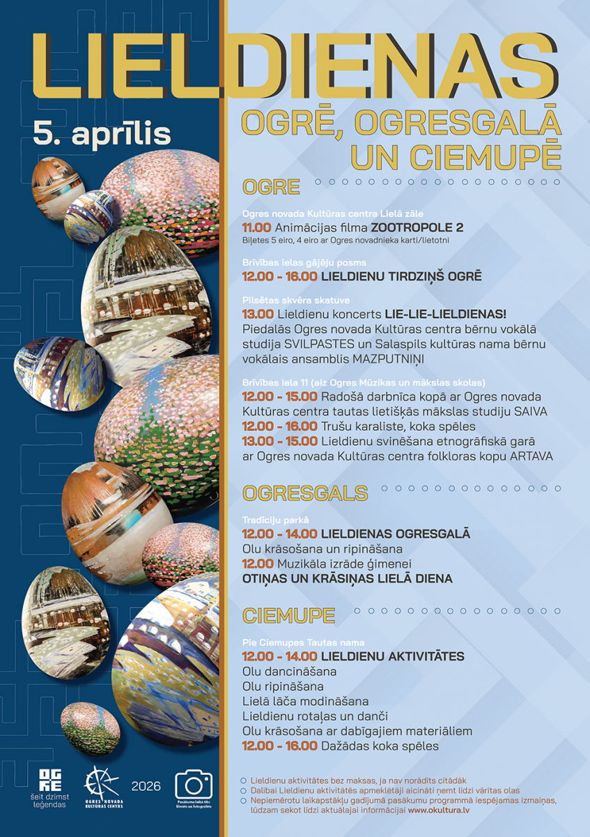 5. aprīlī Ogrē, Ogresgalā un Ciemupē aicinām svinēt Lieldienas iepazīstot pavasara saulgriežu tradīcijas, radoši darbojoties, baudot mūziku un piedzīvojot jautras aktivitātes visai ģimenei.